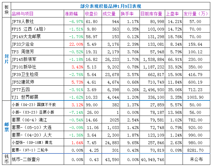 JF33少运会、JF9广告、JF12针灸大会、JF17人民日报、JF100广播电台,TP2梅兰芳等,小盘品种今天表现积极,买盘支撑,涨幅居前,表现较好。TP8三孔、丹东风光、开平碉楼等收跌幅度较大,跌幅居前,表现较差。