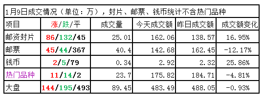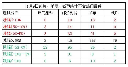 邮票板块:微跌,弱势震荡。套票西藏、春节小型张、六邮双联小型张、牛郎织女小本票、二轮牛套票、凤翔丝绸小版等有一定买盘支撑,表现较稳,横盘震荡。三轮猴套票、大闹天宫小本票、宋词小全张、潘天寿作品选、小鲤鱼小本票等,有较大买盘挂单。