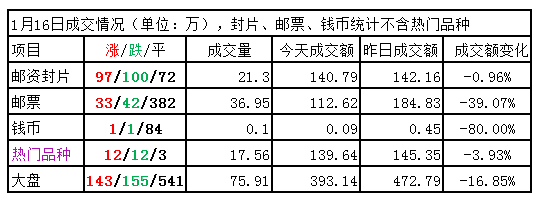 邮票板块:微跌,延续弱势,但有资金支撑的品种稍有增加。古桥、亚展小版、马鹿,小幅反弹,二轮牛套票、09牛赠版、石涛作品、三国五小型张、六邮双联小型张、改革双联小型张、梁平丝绸、红楼梦小版等有一定买盘支撑。