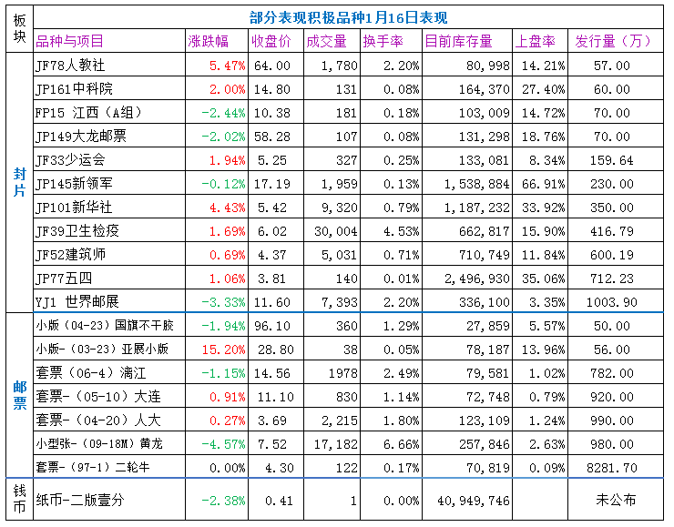 人教社,JF9广告、农工民主党、亚洲杯、中山站、JF28淮河、JP161中科院、园艺会等,有一定积极买盘,不同程度收涨,表现较好。新疆风光(A组)等,JF13共青团、巫山小三峡等,收跌幅度较大,跌幅居前,表现较差。