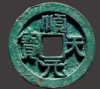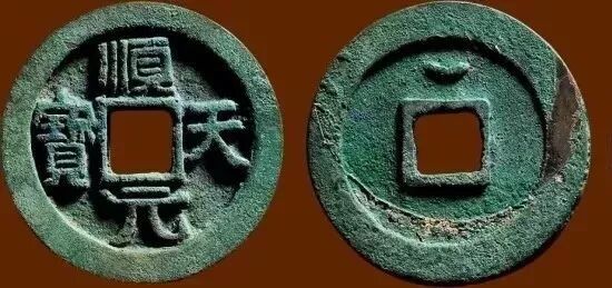 唐叛将史思明公元760年占洛阳,自号大燕皇帝,建元顺天,铸顺天元宝,形制,色泽均同于得壹元宝,钱文隶书,径37.5厘米,重20.8克,钱背多有星,月纹,铸行壹年有余,故传世较得壹元宝多。顺天元宝普通版三千左右。