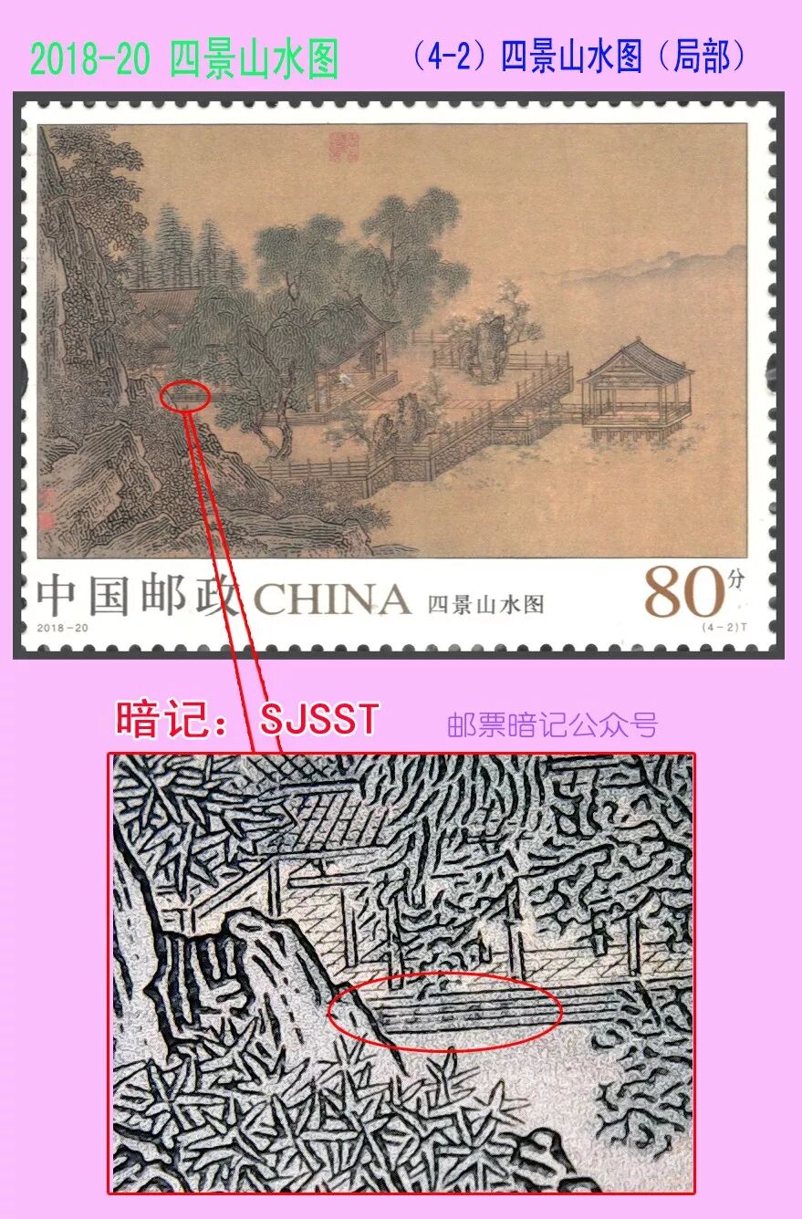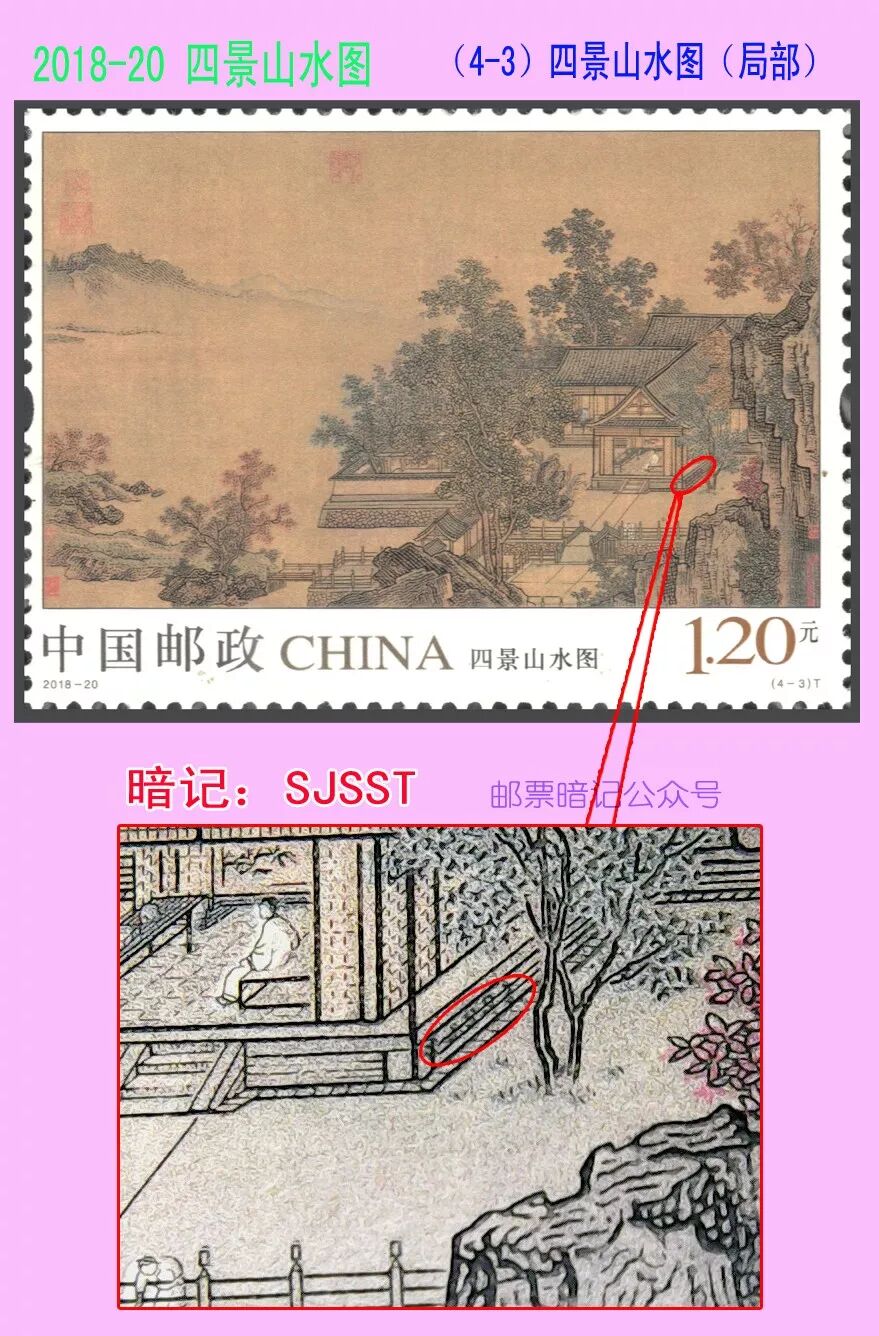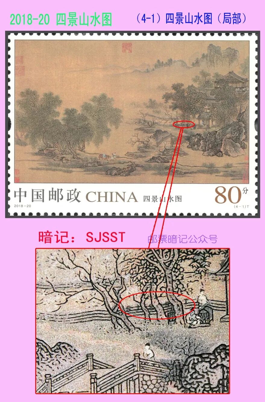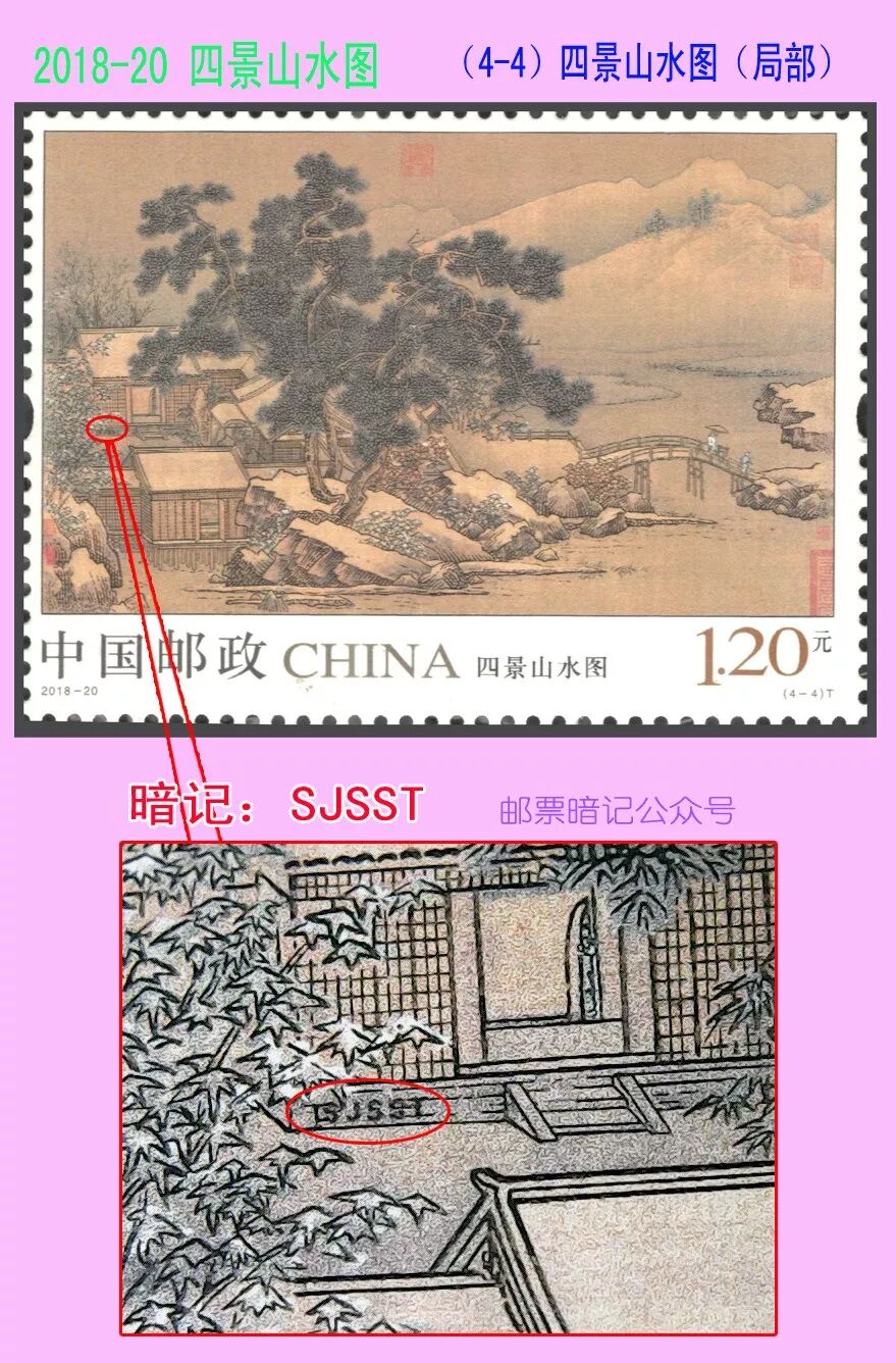 四枚邮票的暗记均由“四景山水图”汉语拼音第一个字母“SJSST”组成。
