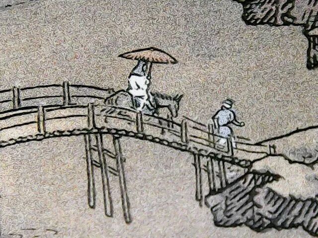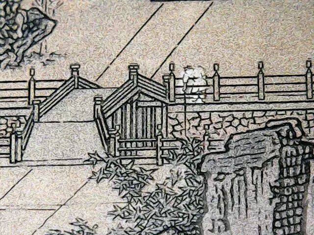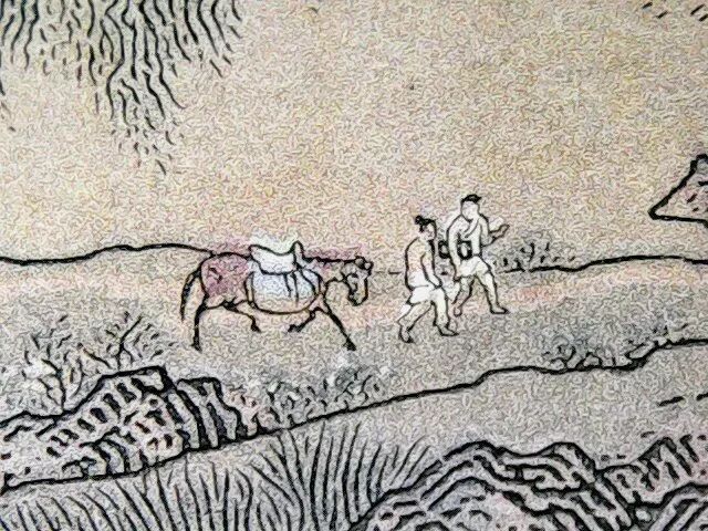 凉亭内外的三人是一个团队——主子(才子)、仆人和挑夫,像是远行赶路(赶考)。穿浅绿色长衫的主人(才子)在凉亭内坐着休息,一定是在低头看书而不是看手机。仆人席地而坐,打开了灰黑色的行李箱往外拿着什么东西。挑夫站在主人(才子)和仆人之间,像是在问主人(才子)今天到哪里住店。过桥的一人从两手交叉在胸前来看,像是女人且是当地人,正不紧不慢地走着,或回家或去超市买东西。大路上行走的是两位穿短打扮的青年男人,一人牵马、一人夹包,正说说笑笑地大步疾走着,说到开心处,夹包者还手舞足蹈。