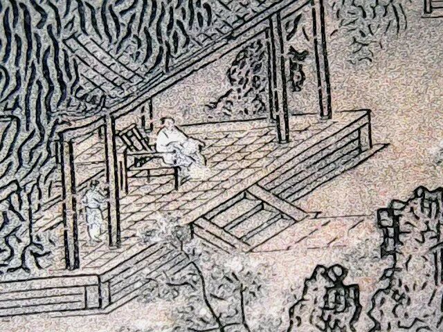 画中的3个人,一人是中心,2人如提线木偶。中心一人是主人,年纪不大,坐在榻上,好像在等待什么。榻前有一桌,桌上有一只没插梅花的梅瓶,梅瓶旁边有什么?看不清,是食物?应该是,姑且认为主人在等待吃饭吧。故提线木偶一样的2个仆人,主人上方的一个仆人正在打开盖子看饭熟否,主人下方的一个仆人正在栏杆边用水桶打水。可怜打水的仆人,不小心将水桶脱钩掉进了水里……