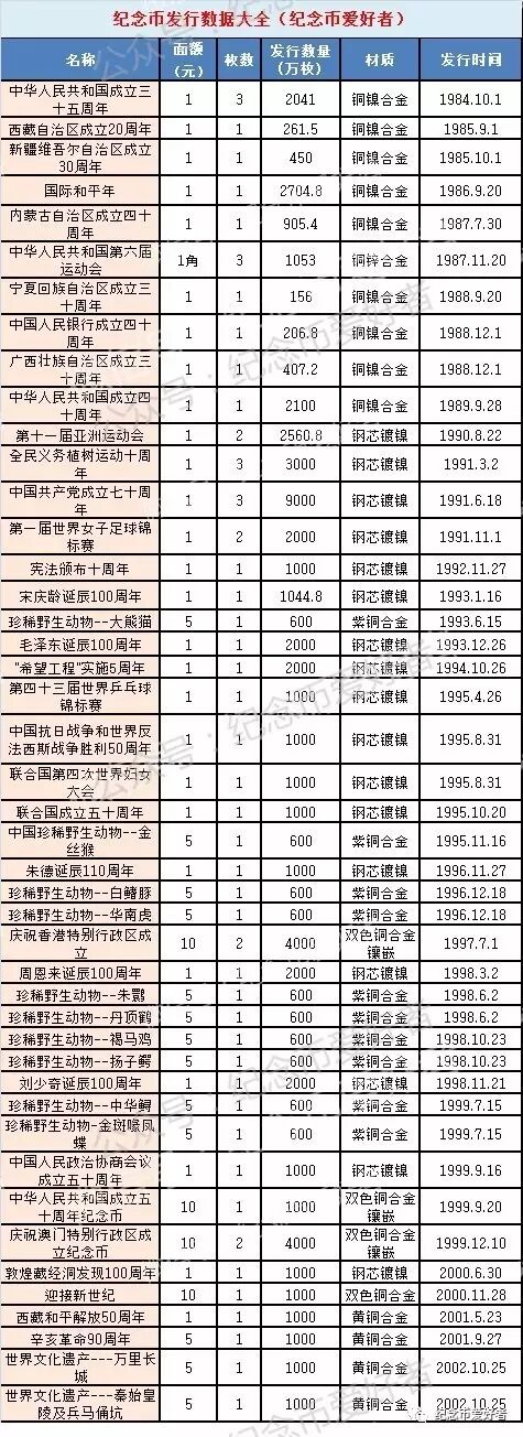 根据央行公布的所有普通纪念币的官方发行数据,按发行时间排序,小编整理了一下,供大家参考。