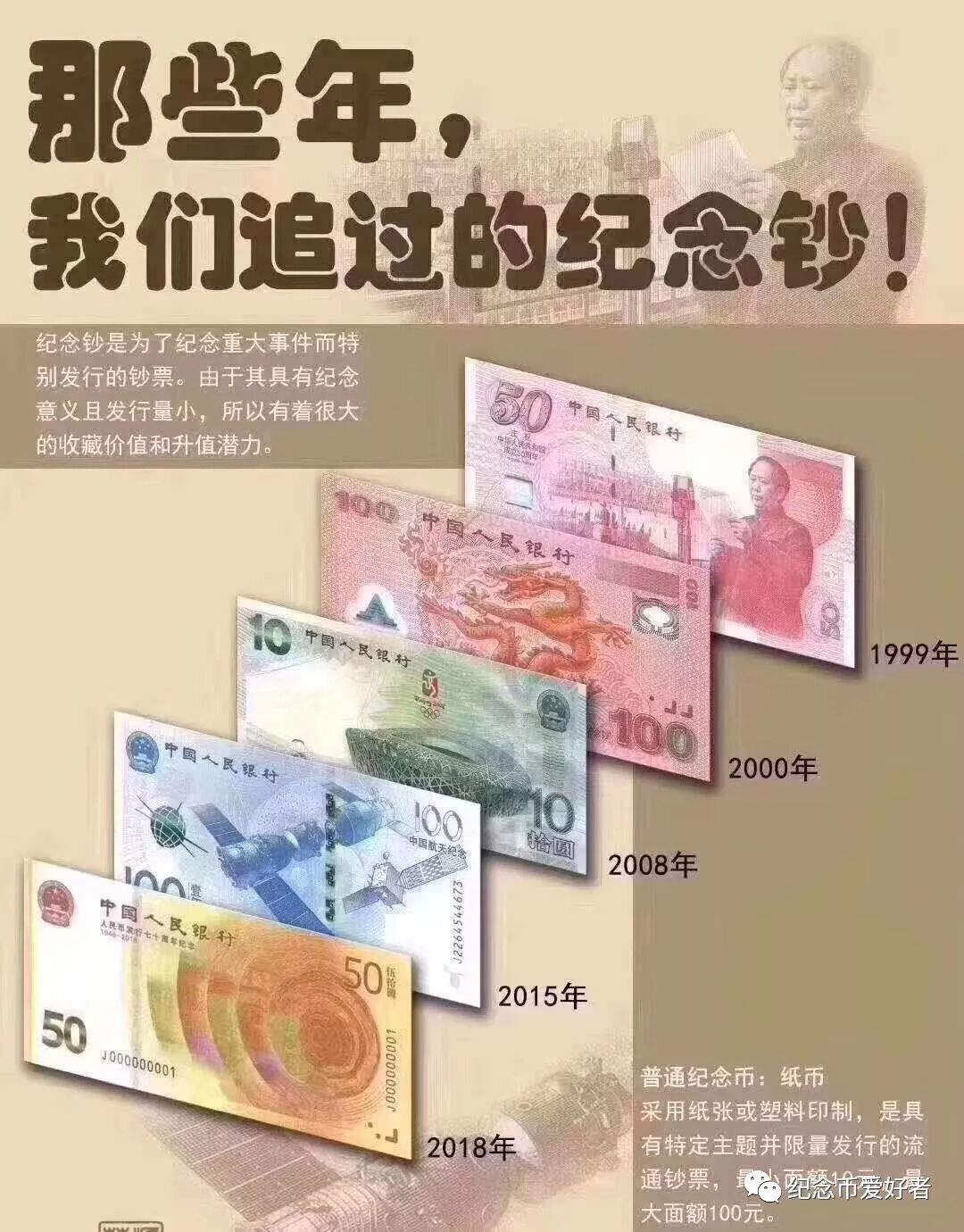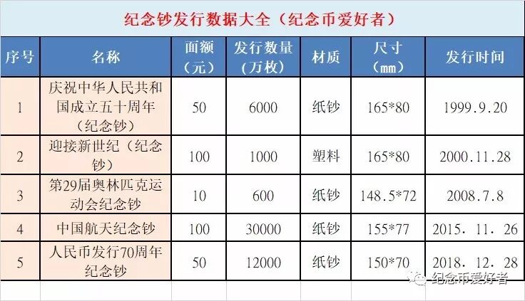 纪念钞发行数据大全(2020最新版) 日期:2020-03-07 来源:邮币之家 小编总结了我国纪念钞家族的官方发行数据,包括具体的发行日期。 我国大陆地区发行的纪念钞数量不多,截止目前只发行五张纪念钞,发行总数量为4.96亿张。 小编整理了一下,供大家参考。 希望未来有更多的纪念钞发行,让纪念钞的家族再壮大。