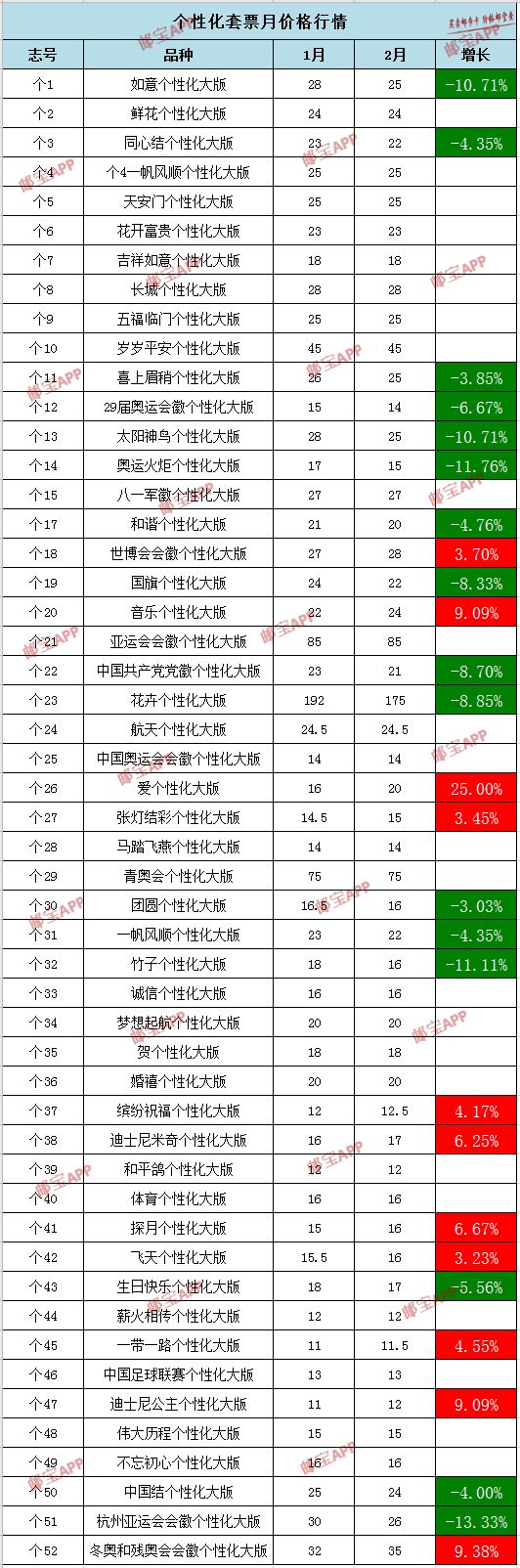 冬奥和残奥会会徽个性化大版1月行情为32元,2月价格为35元,上涨9.38%。