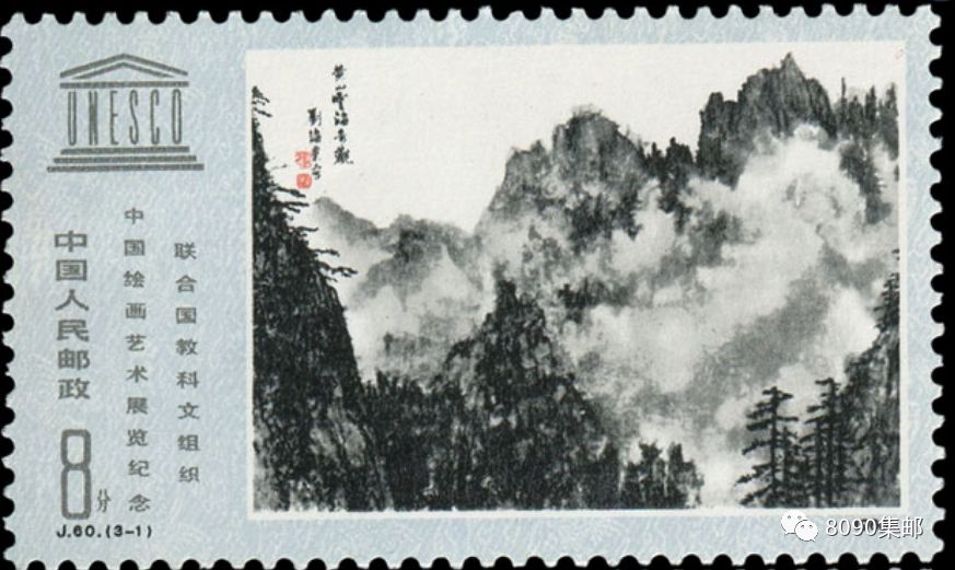▲J60《联合国教科文组织中国绘画艺术展览纪念》邮票(3-1)《黄山云海奇观》