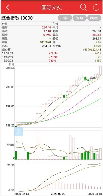 3月18日,国文白盘经过6天横盘整理后,再次大涨,综指最高280.64,最低263.34,收于280.44,涨幅6.49%。