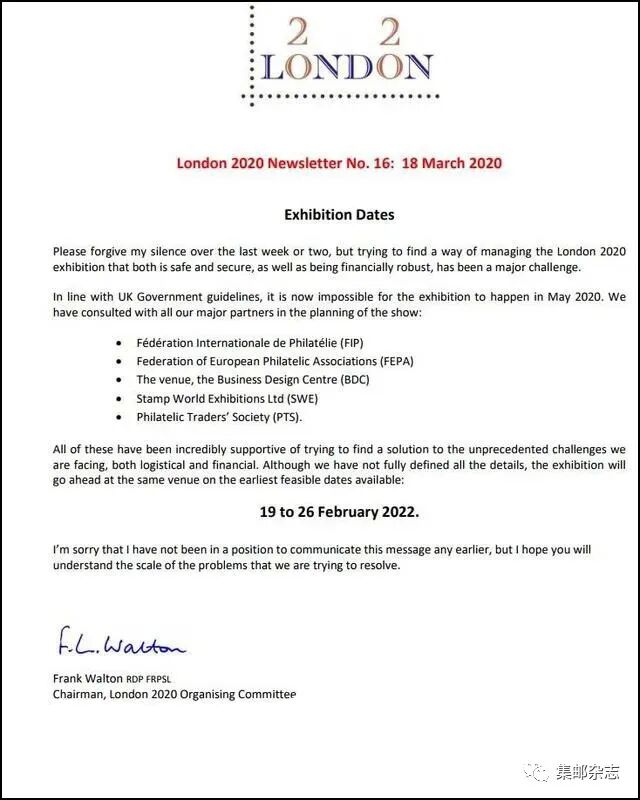 2020年伦敦世界邮展推迟到2022年举行 日期:2020-03-19 来源:集邮杂志 据2020年伦敦世界邮展官网消息,因英国疫情蔓延,2020年伦敦世界邮展组委会主席沃尔顿宣布原定于今年5月份举办的伦敦世界邮展推迟到2022年2月19日至26日举行。