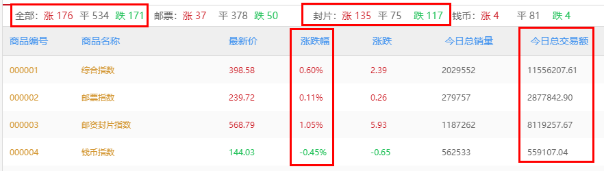 京东文娱寄卖商城商品行情(目前主要分析邮资封片、邮票和钱币板块),以下图表皆可点击放大查看。