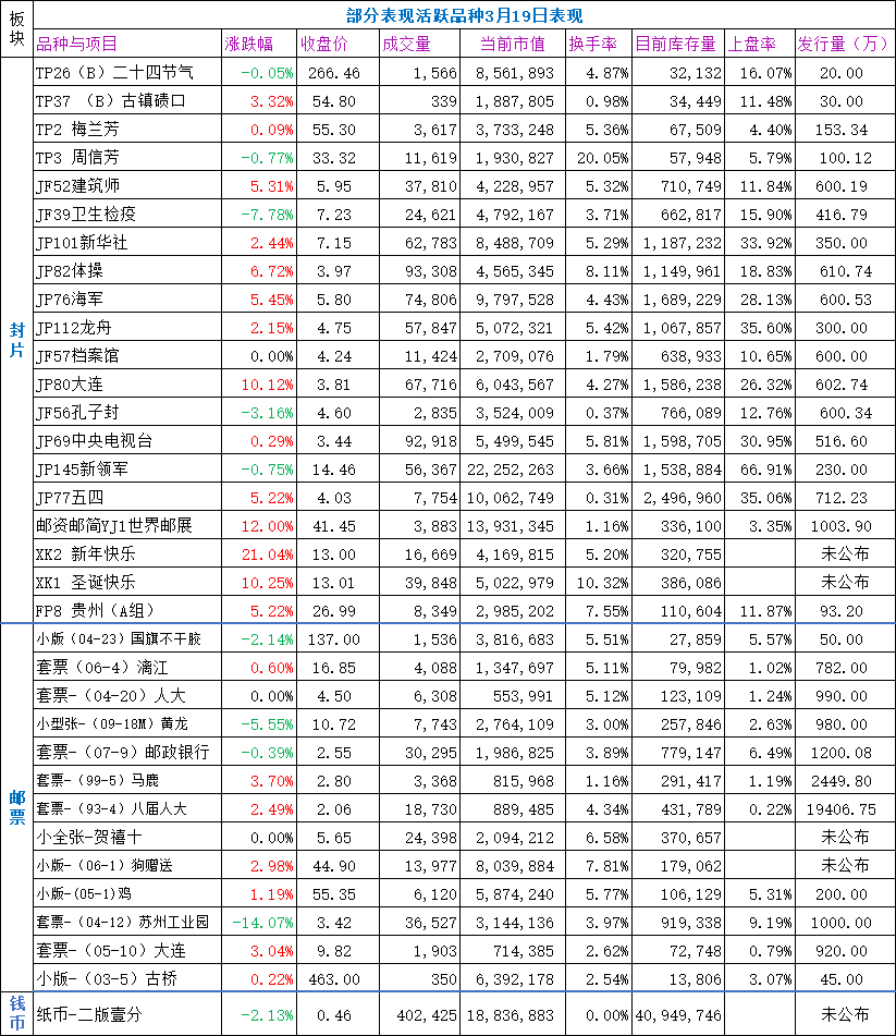 热门品种板块,小幅收涨,反弹积极,涨跌平比为25/13/4,封片品种表现较好,涨幅前十四名均为封片,信卡新年快乐、圣诞快乐、邮资邮简、贵州等引领反弹,体操、大连、海军、建筑师、五四等也表现较好。邮票方面,狗赠送、八届人大、鸡小版等收涨。钱币二版壹分,表现不佳,小幅收跌。