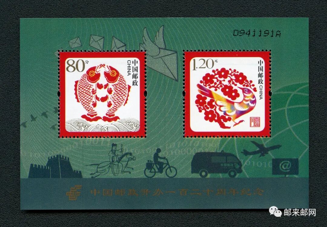 为配合中国邮政开办一百二十周年纪念活动,采用“年年有余”和“喜临门”邮票印制《中国邮政开办一百二十周年纪念》小全张1枚,售价3元,规格为120×80毫米。