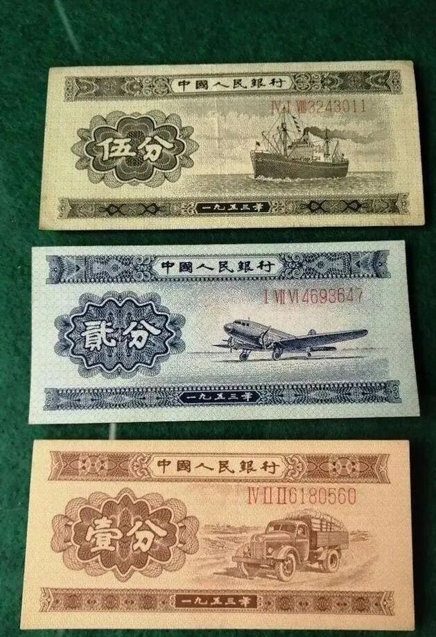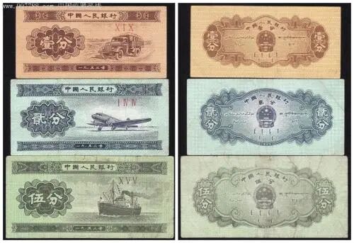 第一版是1953年版:三冠字带七位阿拉伯数编号券(俗称长号纸分币),这套分币存世量较少,是纸分币中精品。其中品相全品的一套收藏价在3000元一套。其中五分券2000-2500元一枚;二分券100-130元一枚;一分券120-150元一枚。