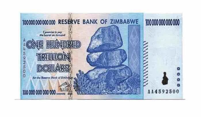 津巴布韦原本是一个矿产资源非常丰富,土地肥沃的非洲国家。但在2000年总统穆加贝开始进行激进的土地改革,强行没收白人农场分给黑人,导致国家经济体系一落千丈,逐渐濒于崩溃。从2006年开始疯狂的发行货币,短短3年时间,津元从最高面值从1000上升到100万亿。其实津巴布韦解放之初,津元还是很值钱的,与美元的汇率是:1:1.47。
