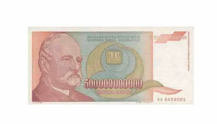 1993年,当时如火如荼的波黑战争导致通货膨胀,物价飞涨,货币贬值。南联盟政府发行了正版货币,实际上这张纸币如果换算成人民币大概只有6块钱。想想,随便一顿早餐就要吃掉5000亿会是什么感觉?