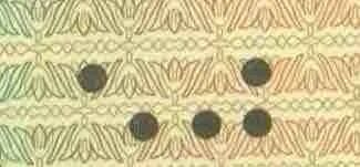 以一个黑点代表数字1,两个黑点代表数字5,三个斜点代表数字0,设计了带盲文币值的钱币画稿。