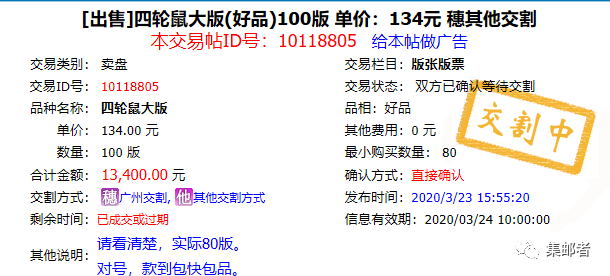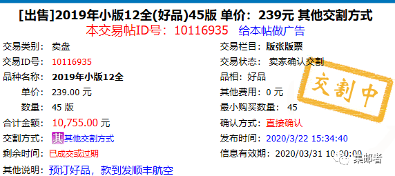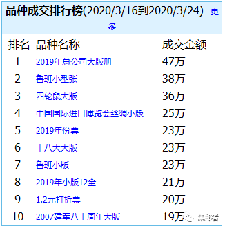 2019年小版还是比较稳定交易排行榜也在TOP10以内,最新成交价在239元,小版也成为2019年最为稳定行情上涨好的品种没有之一,虽然2020年暂时还没有小版张发行,但相信很多邮友早已期待2020年的小版行情。
