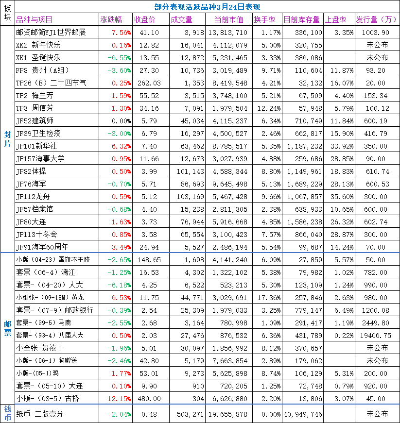 邮票板块:微涨,相对抗跌。黄龙、鸡小版、八届人大、丝绸之路、柳毅加标等,较为活跃,收涨,表现稍好。贺禧十、国旗不干胶等小幅回调,套票人大跌幅稍大,表现较差。