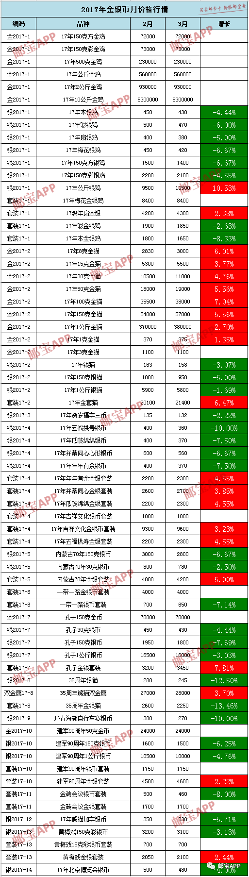 17年瓜瓞绵绵金银套装上月行情为2200元,本月价格为2300元,上涨4.55%。