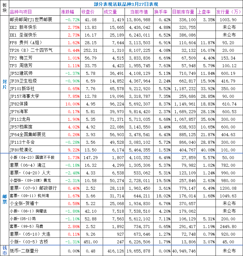 邮票板块:整体微跌。除热门品种八届人大、国旗不干胶、杭州湾、贺禧十、邮政银行等表现稍好外,柳毅加标、马鹿、边陲风光、漆器与瓷器等也有一定积极表现。套票人大、黄龙、狗赠送等小幅收跌。