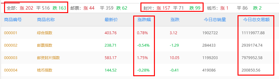京东文娱寄卖商城商品行情(目前主要分析邮资封片、邮票和钱币板块),以下图表皆可点击放大查看。