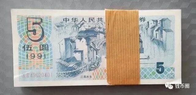 原来这不是藏友的恶作剧,而且这种伍圆纸币是确切存在的,这些伍圆纸币属于国家发行的国库券,很多人没见过是正常的,确实是大伙孤陋寡闻了。这种国库券,它也有面值一百元,五十元,十元,五元等等。藏友拿出来这些是较小面值的,而这种国库券是1991年发行的。上面的图案是“江南水乡”,图案非常的精美。