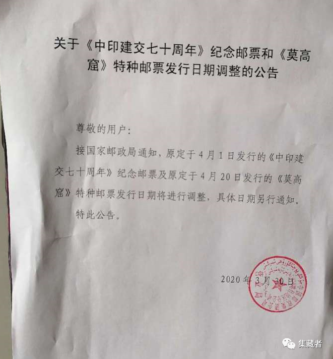 中国邮政推迟发行2套邮票:原计划在4月1日发行的《中印建交70周年》及4月20日发行的《莫高窟》推迟发行,具体日期另行通知。