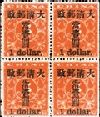 在小壹圆邮票中,四方联又是其中的珍品,因为存世仅一件,其中四方连最早在上海海关人员费拉尔手中,费拉尔购到小壹圆后,一直严守秘密,直到他去世后20年,才被上海的英国邮商施开甲在其遗孀处探知。当时在上海的著名集邮家周今觉,得知这一信息,经过3年多的谈判,于1927年以2500两纹银购到手,这个数字创造了当时亚洲邮票买卖价格的最高记录。周今觉获得这件红印花加盖小字当壹圆四方连后,提高了中国邮票的国际地位,他本人也获得华邮之王及邮王之美称。目前该票在台湾集邮家林文琰手中,这是他于1982年以30万美元从美国购回的。
