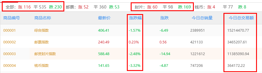 京东文娱寄卖商城商品行情(目前主要分析邮资封片、邮票和钱币板块),以下图表皆可点击放大查看。