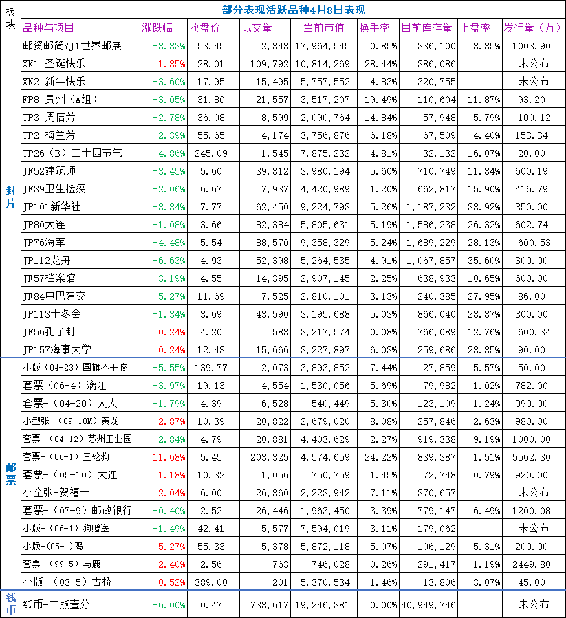 板块327个品种,4元以下品种76个,较昨天增加4个,板块内最低价为JP83少先队3.07元,比昨天的最低价下降0.11元,板块整体小幅回调。成交额前50名,涨跌平比为5/45/0,最大涨幅为JF99中新建交收涨9.94%,最大跌幅为JP34集邮联收跌-9.23%。
