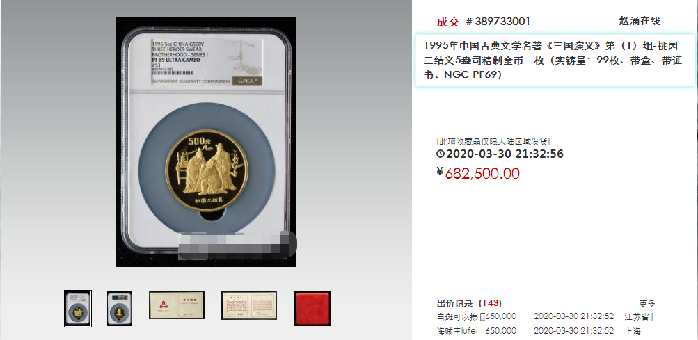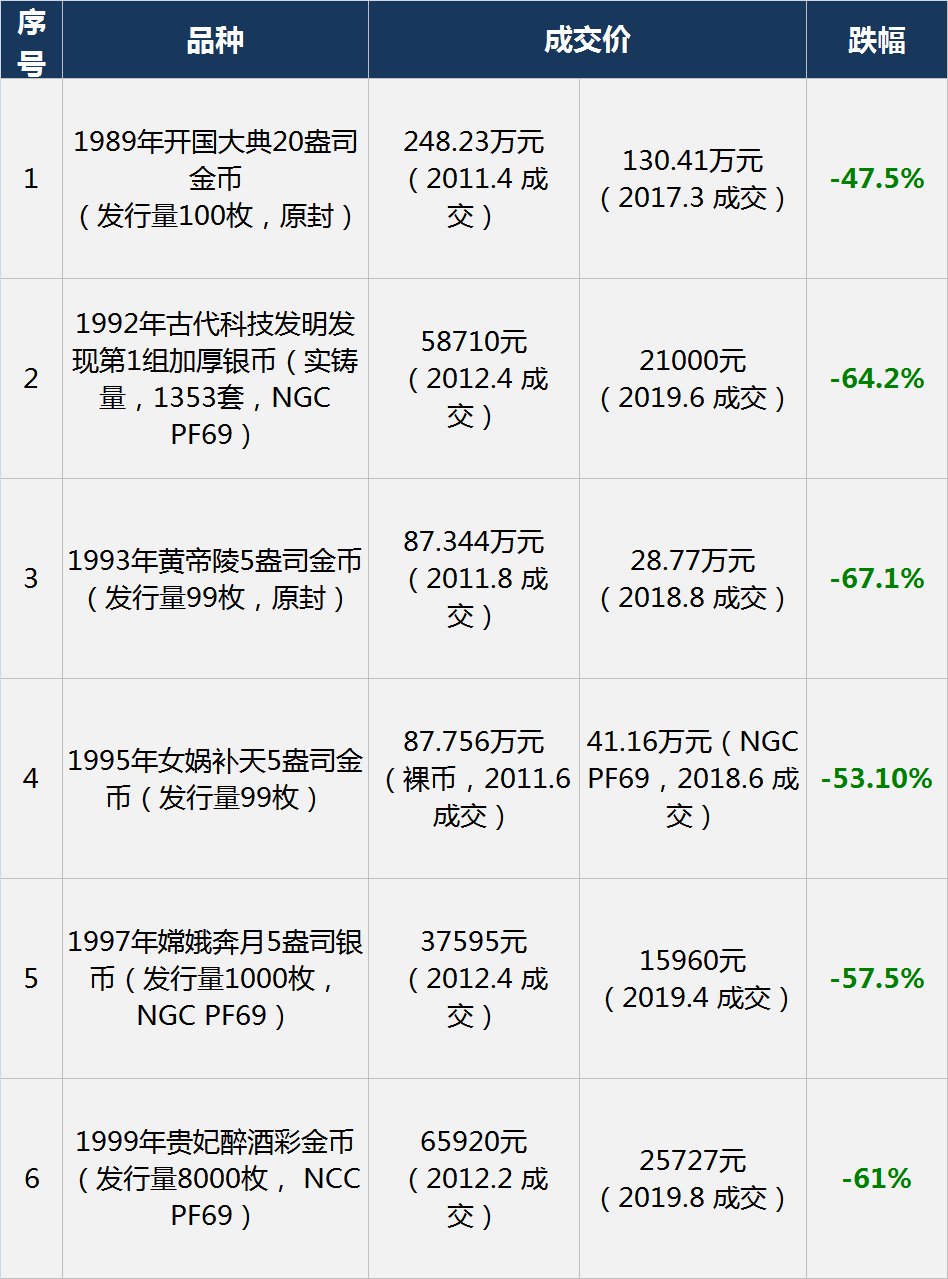 暴跌62.35%!老精稀币路在何方? 日期:2020-04-13 来源:纪念钞俱乐部 3月30日晚,一枚桃园三结义5盎司金币(NGC PF69)在国内某知名收藏网站结标。该币发行于1995年,为《三国演义》系列第1组,实铸量仅99枚,盒子、证书齐全(号码00053)。作为早期大规格金币,获评NGC69分,品相已十分难得。当晚,该币吸引了众多买家的追逐,经过143轮竞价,最终以68.25万元成交(含服务费)。在2010年12月28日,该品种曾有一枚裸币(证书00012)在该网站成交,成交价为181.28万元(含服务费)。十年轮回,在品相相差无几的情况下,该币的成交价下跌了113.03万元,跌幅高达62.35%。 对比十年来的成交价,着实让市场各方震惊:长期以来,这批发行量极少的金银币被市场追捧,被冠以“老精稀”的雅称,具有强大的市场号召力。如此经典的老精稀品种,为什么会跌得惨不忍睹?笔者以为,此次该币的成交将成为金银币市场的一个标志性事件。 老精稀全线下跌在2001-2011年黄金、白银价格10年牛市(同时伴随人民币升值因素)的过程中,随着大量社会资本的介入,中国现代金银币的价值被市场充分挖掘,整个板块的涨幅可观,老精稀币的涨幅更是惊人,少则几倍,多则十几倍、甚至几十倍的品种纷纷涌现。物极必反,在2011年四、五月间,随着黄金、白银10年牛市的终结,金银币板块开始步入漫漫熊途,10年来跌跌不休,刚成交的这枚5盎司桃园三结义金币正是老精稀币长期下跌的缩影。▼2011-2020年部分老精稀金银币成交价对比从上表可见,老精稀金银币10年来已经跌得面目全非,如何看待这种暴跌呢?金银币属于贵族收藏品,国内收藏者群体本身就不大,市场上有能力收藏老精稀币的人更少,像5盎司桃园三结义金币如此高昂的价格,绝非一般泉友所能承担。同时,这类品种买、卖差价大,虽然有各种拍卖成交价作为参考,但是同一枚币,得找到买家才有可能卖出去,市场的实际成交价比拍卖价低5%-10%实属正常,一些超高档币更是曲高和寡,有价无市。▼梅兰芳彩金币 收藏价值仍较高中国现代金银币自1979年问世以来,以题材优异、设计精美、材质高贵等优势,受到海内外收藏者的喜爱。特别是早期发行的金银币,由于那个年代的中国人还没有收藏金银币的经济实力,因此当时发行金银币以出口创汇为目的,造成大量早期金银币被海外泉友收藏。不少早期币发行量极少,产生了一批发行量100枚以内的金币、1000枚左右的银币。以这枚5盎司桃园三结义金币为例,实铸量仅99枚,作为三国演义系列的第一枚龙头品种,题材优异,是老精稀的代表品种,无疑具有极高的收藏价值。▼桃园三结义5盎司金币 风雨过后现彩虹10年来,5盎司桃园三结义金币产生了62.35%的跌幅,笔者以为:68.25万元也许不是本轮调整的最低价,但风险已有效释放,单边下跌的走势即将结束,将逐步构筑底部。同样,整个老精稀板块在本轮熊市中大幅杀跌,风险大幅释放,即将或已经进入有价值的投资周期。▼开国大典金币老精稀金银币发行量少、题材优异、设计精美,有着很强的品牌效应。笔者预计,即使未来黄金,白银价格没有大的涨幅,老精稀币还是会有行情,会产生不错的涨幅,但是难以再现黄金十年的疯狂行情,因为人民币升值大周期早已结束,炒作资金亦已撤离,新的资金一般不愿去抬轿。对于收藏爱好者而言,深幅下跌的老精稀币给了大家一个拾遗补缺的好机会,如今,只要花过去三、四成的价格,就能买到自己心仪的老精稀品种,笔者觉得还是值得的。需要注意的是,由于发行年代久远,不少老精稀币存在品相瑕疵,大家一定要通过正规渠道购买,或者购买顶级评级机构作出的评级币,这样才能不会上当受骗。当然,及时提高自己的币识鉴赏水平,练就火眼金睛,才能长久立于不败之地。