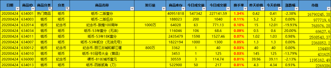 钱币换手率前十: