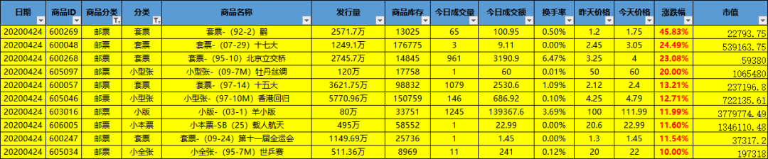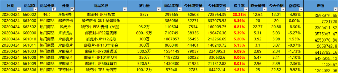 邮资封片换手率前十: