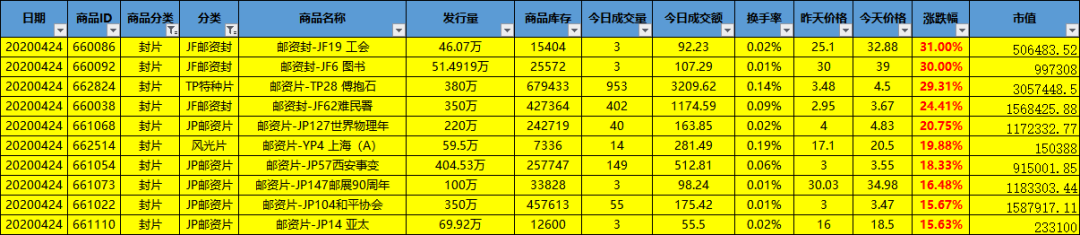 邮资封片涨幅前十: