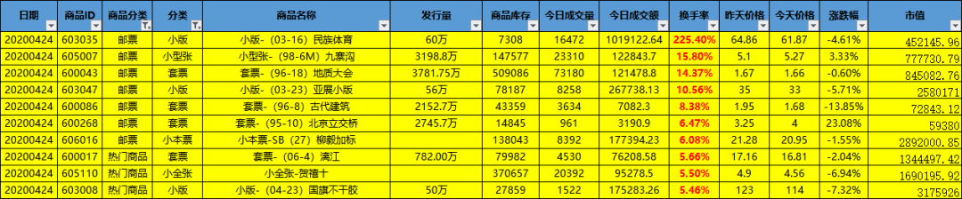 邮票换手率前十: