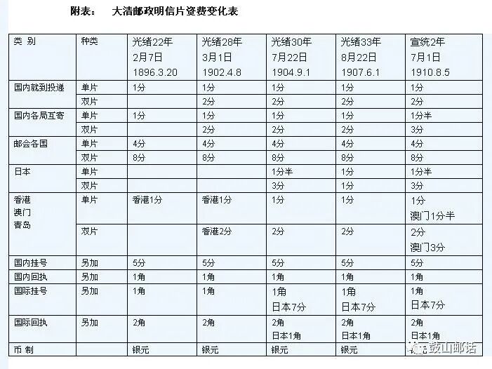 大清邮政至1911年辛亥革命爆发清王朝被推翻,15年间先后发了四次大清邮政潘龙图邮资明信片。除第一次只有单片一种外,其余三次均有单片和双片两种,前后共有七种。大清邮政明信片资费变化详见下表: