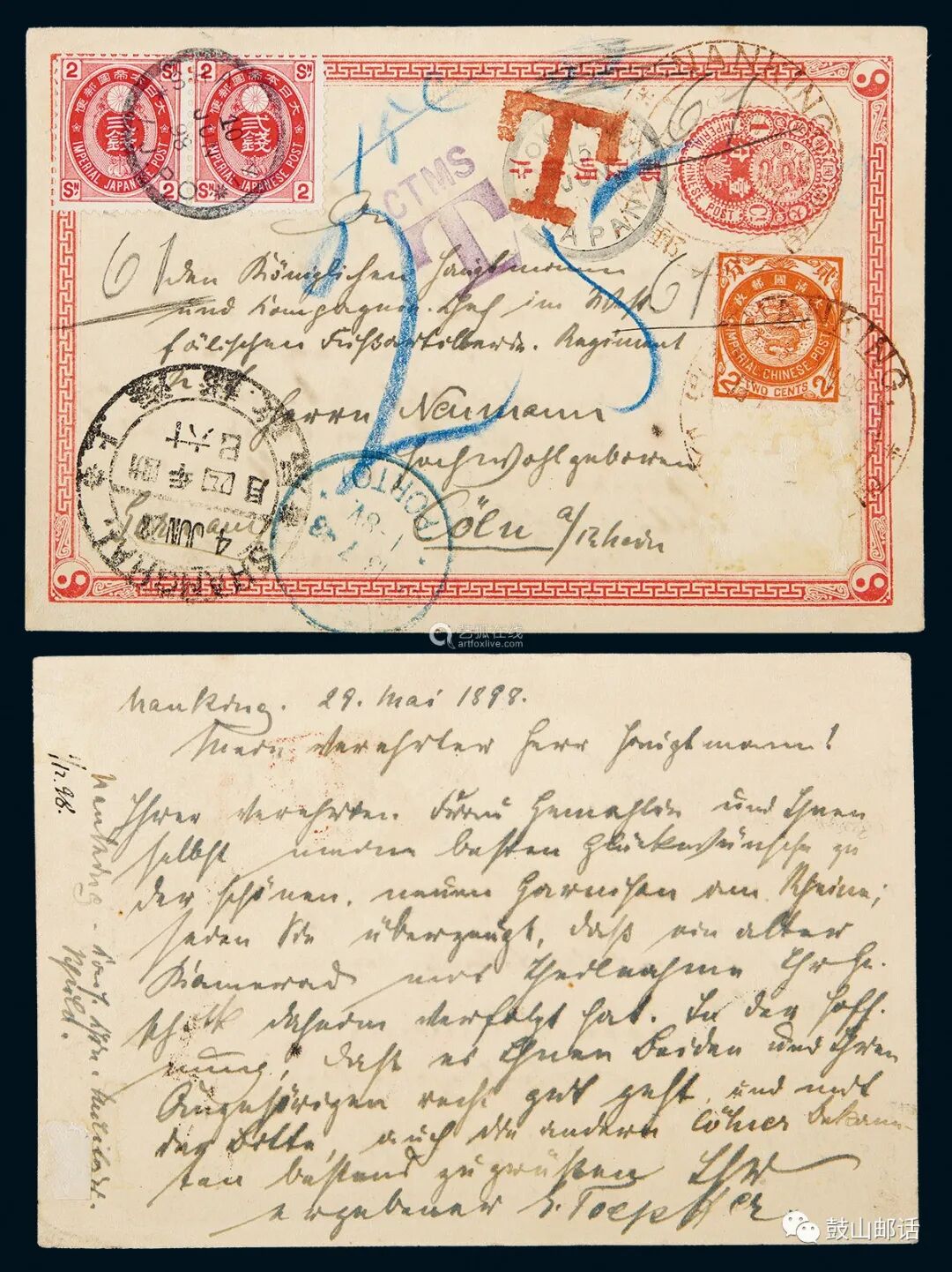 1878年12月11日,天津海关中心邮局致牛庄、天津、烟台、和上海的海关书信馆总字第2号文,明确要求:“凡经由海关书信馆转交驻上海的外国邮政机构发往国外的邮件,除了要按照由海上或陆路运往上海所需要的邮资加贴中国邮票外,可允许寄件人任意使用印有各种邮资的外国邮票。为此确定:外国邮票贴在写有收件人名址的一面,而中国邮票则贴在背面”(《天津邮政史料第一辑》233页)。