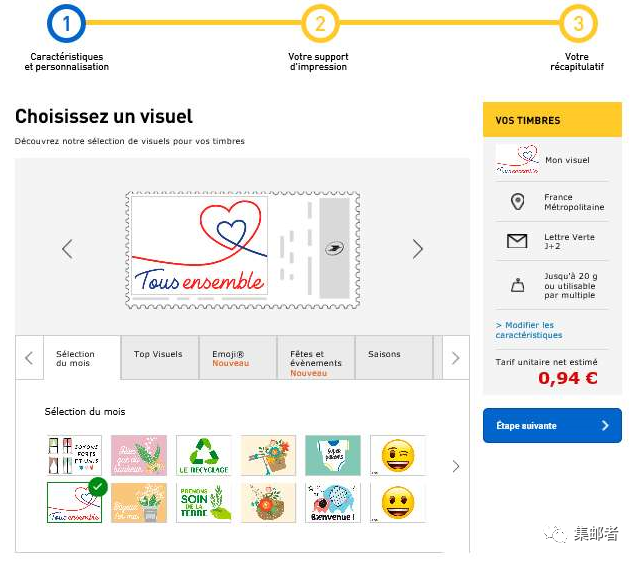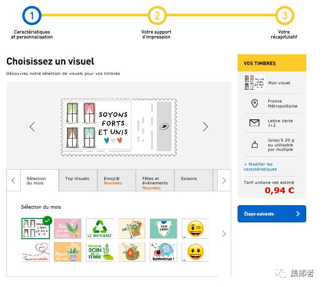 关于法国发行的“抗疫邮票”,法国邮政官方答复却是... 日期:2020-04-28 来源:集邮者 但最近有许多邮友联系我们,想购买法国发行的"抗击疫情"的邮票(如下图): 我们与相关渠道沟通后,得到法国邮政官方答复:法国从未发行与"抗击疫情"相关的邮票,上述这套邮票为法国发行的个性化邮票,提供了很多默认的邮票图案,也可以自己上传图案进行设计(如下图): (法国邮政官网截图) (法国邮政官网截图)