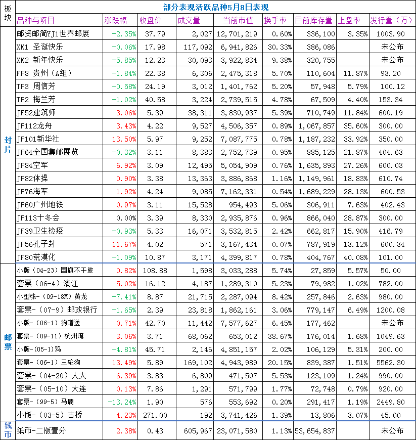 邮票板块:微涨横盘,杭州湾、十大将、步辇图小型张、寿山石雕、朱仙镇等有少量买盘支撑。