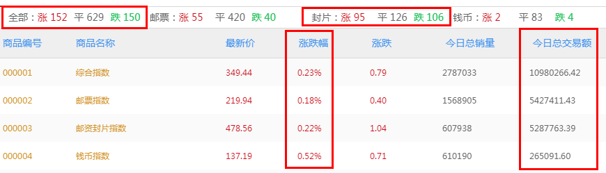 京东文娱寄卖商城商品行情(目前主要分析邮资封片、邮票和钱币板块),以下图表皆可点击放大查看。