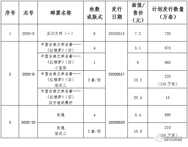 评析:《玫瑰》《红楼梦》《亚洲文明》计划发行量 日期:2020-05-10 经国家邮政局审定,《亚洲文明(一)》《中国古典文学名著——〈红楼梦〉(四)》《玫瑰》特种邮票计划发行数量如下: 红楼梦和玫瑰发行量都有点大,分别为970万和890万,恐怕打折在所难免。小型张今年继续减量到660万,还是有潜力的。小版的发行量在2019年降至100万后,今年没有继续减量,看来去年99万就是底线了。今年已经公布发行量的小版最少也有105万,和去年差不多。720万的亚洲文明值得关注,成为今年目前为止套票发行量最少的。短腿越来越短,四方连风琴折从30万降至去年的20万,今年继续降至15万,估计此品种会成为爆款。