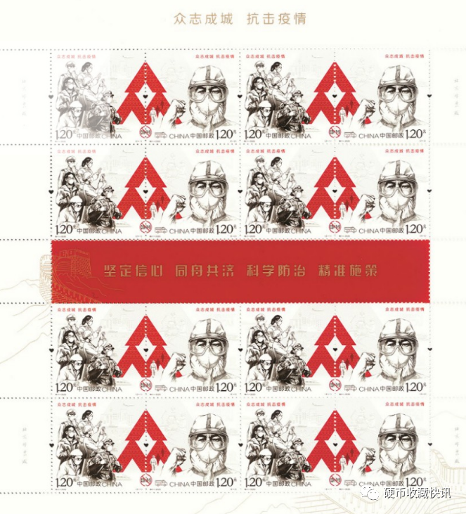 第二图,以拳头紧握、刚毅决然的医务工作者形象为主体,背景饰以救治场景、逆行支援背影、方舱医院等,刻画出医护人员不畏艰险、救死扶伤、医者仁心、大爱无疆的崇高精神。黄鹤楼地标图案,展现武汉这座英雄的城市自觉服从疫情防控大局需要,不畏艰险、顽强不屈,主动投身疫情防控斗争而做出的重大贡献,寓意着武汉胜则湖北胜、湖北胜则全国胜。画面中的“AI”等科技元素寓意科学技术在防疫中发挥的重要作用。该套邮票由王虎鸣、刘向平设计,北京邮票厂影写版工艺印制。