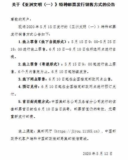 出售办法:自发行之日起,在全国指定邮政网点、集邮网厅(https://jiyou.11185.cn)、中国邮政手机客户端和中国邮政微邮局集邮微信商城出售,出售期限6个月。