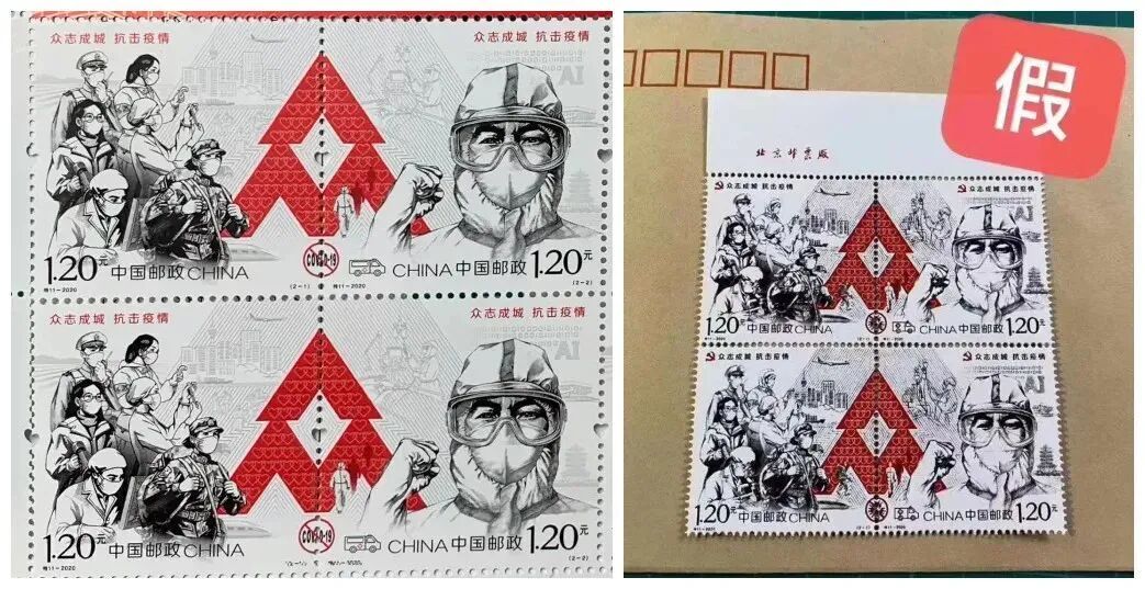 抗疫邮票这么火!行情高涨!不法分子开始造假啦。下图就是真假抗疫邮票对比图: