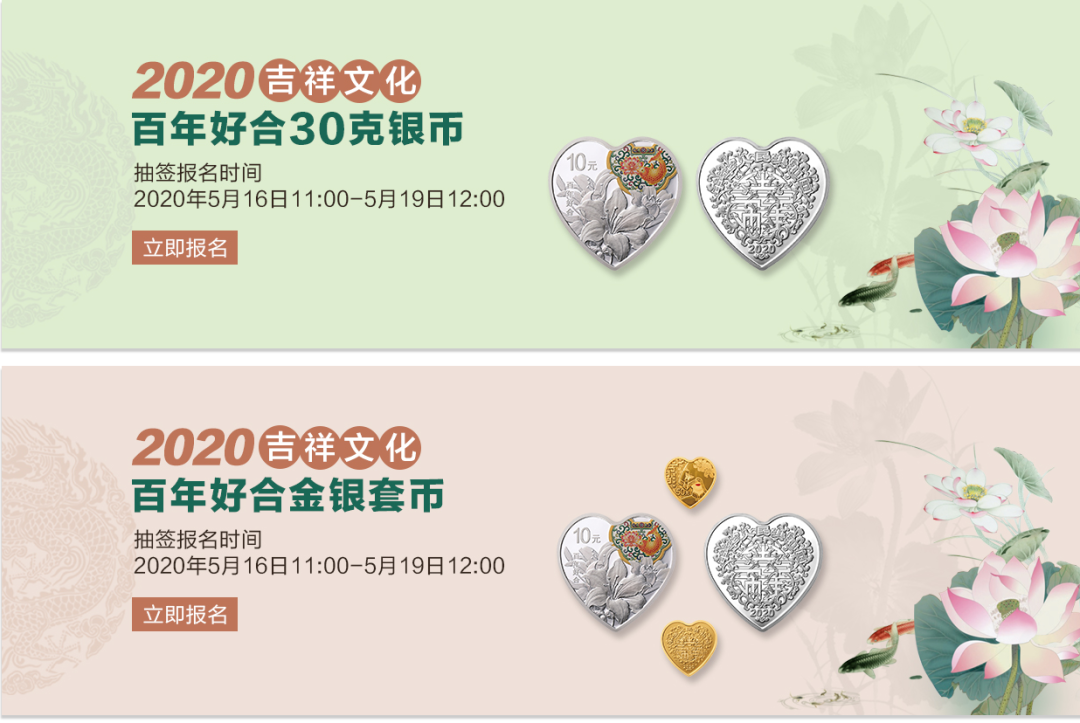 下滑页面,找到百年好合30g银币或者百年好合金银套币,选择你喜欢的一个点“立即报名”。