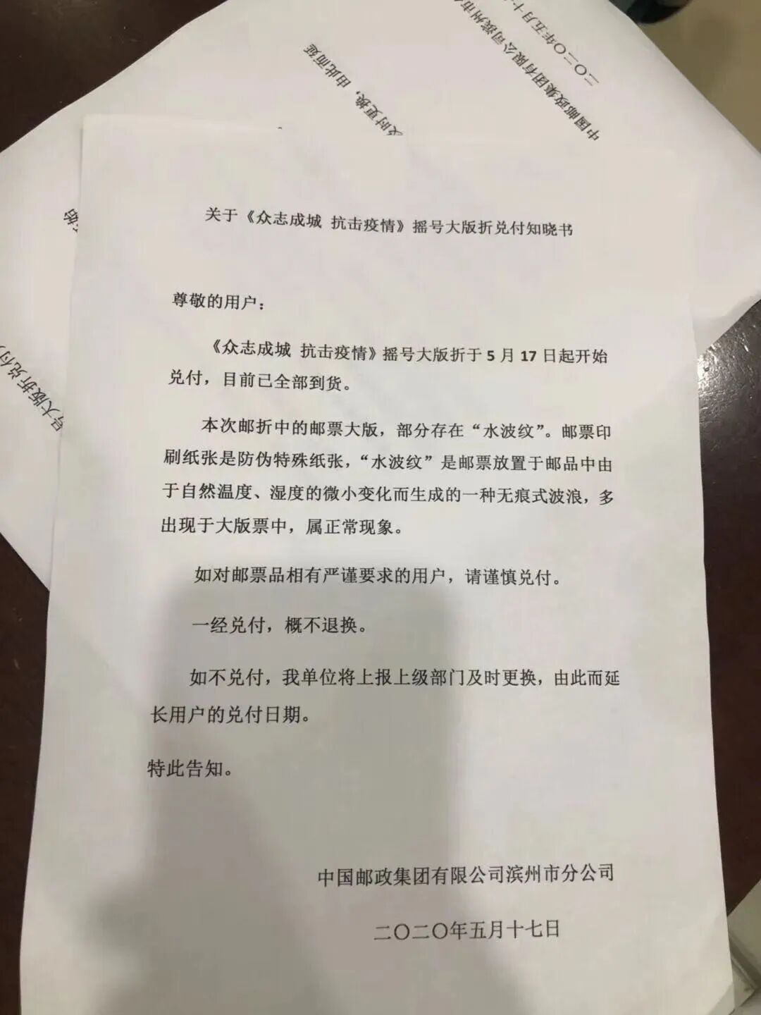 尊敬的用户,因《众志成城 抗击疫情》整版邮折【摇号】中有个别邮票受潮,为了保障您的利益,我们正在抓紧调换,并在1周左右尽快为您兑付。给您造成的不便敬请谅解!