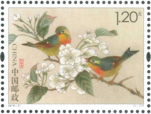 2016年七夕节,中国邮政发行一套一枚《相思鸟》特种邮票。邮票画面采用中国画工笔重彩的表现形式,一对相思鸟在梨花间,暗含“成双成对 不离不弃”之意。整版邮票姿态生动、栩栩如生,将相思鸟的温馨浪漫表现的淋漓尽致。