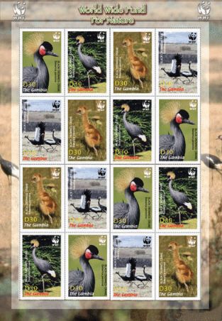 冈比亚2006年2月发行了一套印有WWF标志(即熊猫徽)的《黑冠鹤》邮票。