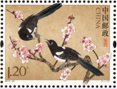 中国邮政于2017年8月28日发行《喜鹊》特种邮票一套1枚,邮票面值为1.20元。